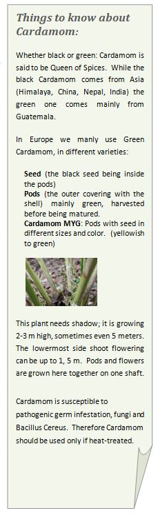 Expensive, precious and rare: Cardamom “Queen of Spices”. Beside saffron and vanilla, cardamom is one of the most expensive spices. Only few countries produce it. Guatemala (approx. 30.000 to), India. Tansania is said to produce only 5.000 mt. Europe has a annual need of 2.000 mt